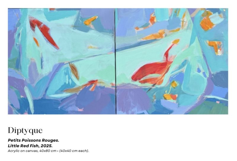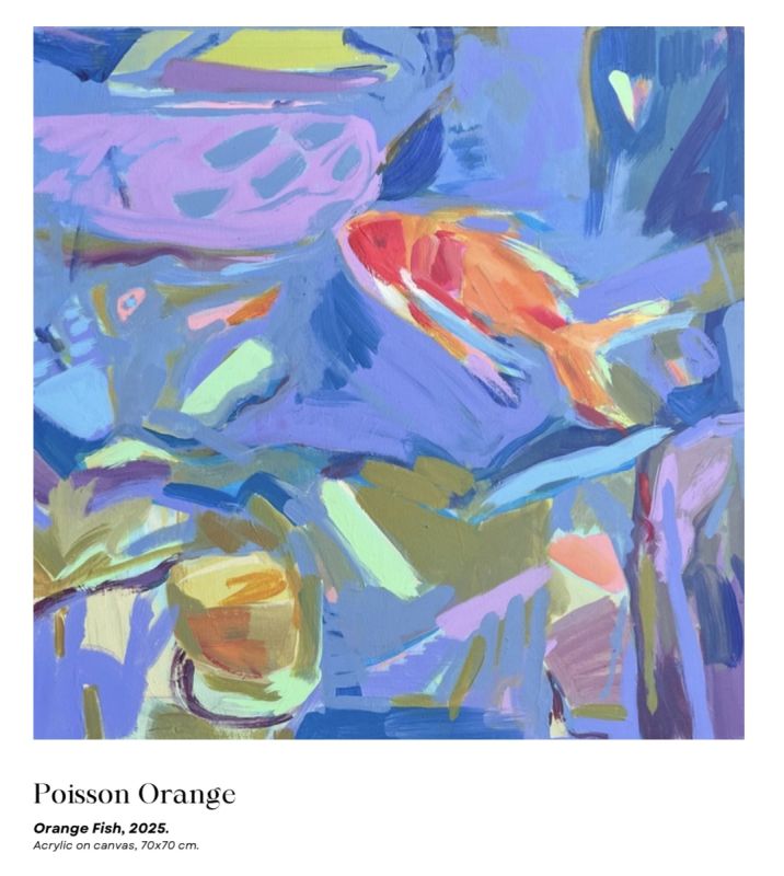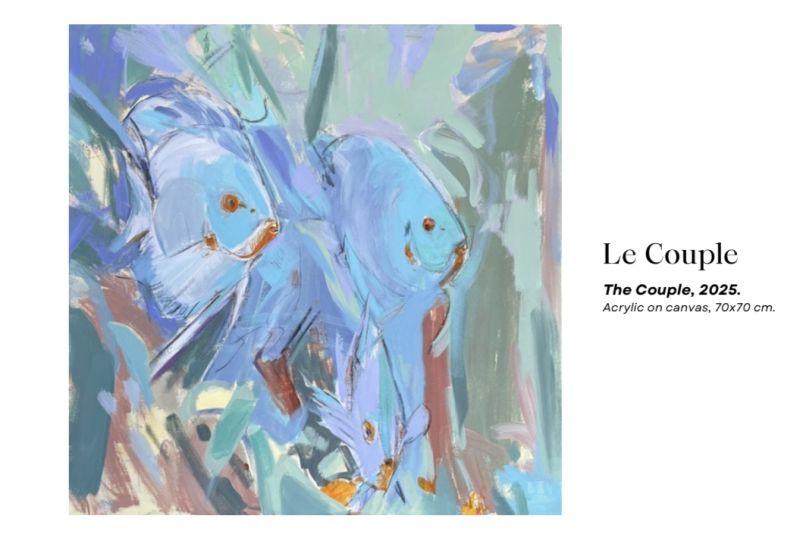 L’inspiration jaillit à la Maison des mers à Vienne, devant ces aquariums immenses, véritables toiles vivantes, qui ont captivé Irène Ghanem lors d’un voyage. Fascinée par la chorégraphie silencieuse des poissons, leurs couleurs changeantes, leurs disparitions soudaines dans l’infini bleu, elle avoue: «Les poissons sont devenus mes muses.» Mais l’aquarium n’était, au fond, qu’un prétexte: «Je voulais ramener la mer jusqu’à mon jardin, faire entrer le mystère de l’eau et du vivant dans mon univers quotidien.» Ainsi, la mer traverse la mémoire et le verre pour s’installer au cœur de sa maison, glissant son étrangeté familière jusque sur la toile.