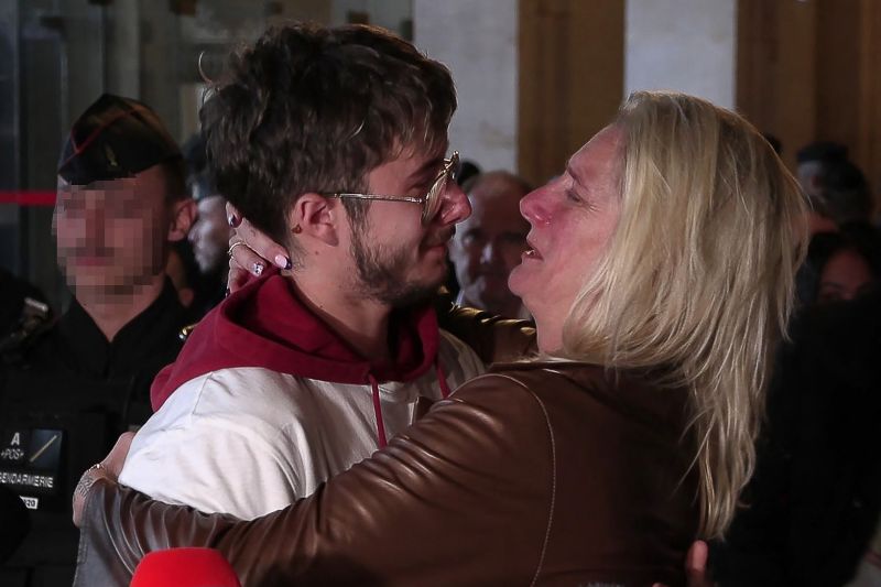 Delphine Daviet (à droite), la mère de Lola, et Thibault, le frère de Lola, s’enlaçant alors qu’ils s’adressent à la presse devant le tribunal à Paris, le 24 octobre 2025. © Louis SIBILLE / AFPTV / AFP