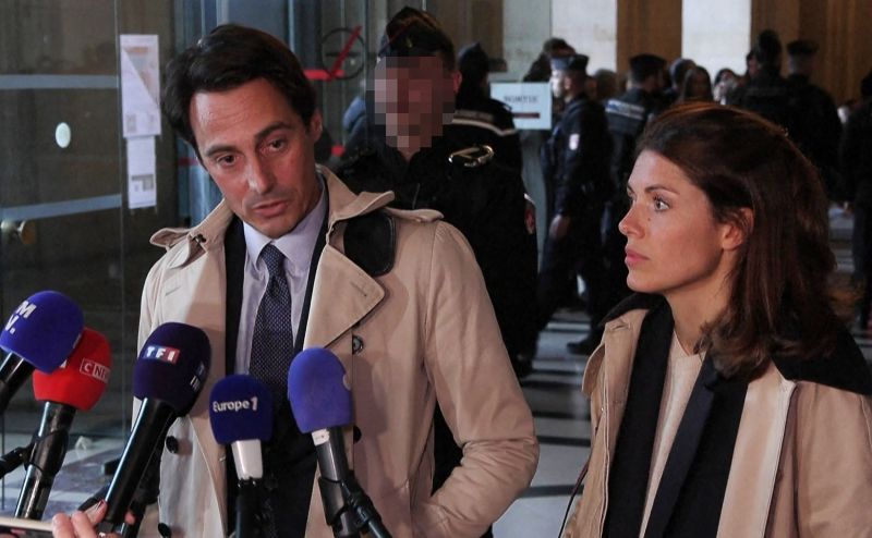 Les avocats de la défense Alexandre Valois (à gauche) et Lucile Bertier s’adressant à la presse devant le tribunal à Paris, le 24 octobre 2025. © Louis SIBILLE / AFPTV / AFP