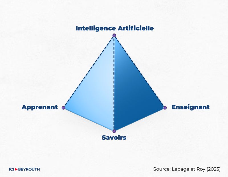 À leur tour, Lepage et Roy (2023) réemploient ce tétraèdre en accordant à l’IA le statut de quatrième pôle comme acteur à part entière dans la relation pédagogique.