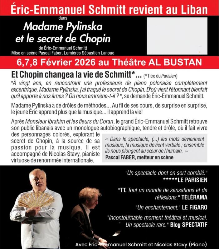 Présenté les 6, 7 et 8 février 2026 au Théâtre Al Bustan, le spectacle prend la forme d’un monologue autobiographique, tendre et souvent drôle, dans lequel Schmitt se raconte à travers une galerie de personnages hauts en couleur. Au centre du récit : une question fondatrice, presque métaphysique. Quel est le secret de la musique de Frédéric Chopin ? Pourquoi touche-t-elle si profondément les âmes, au point de transformer une vie?