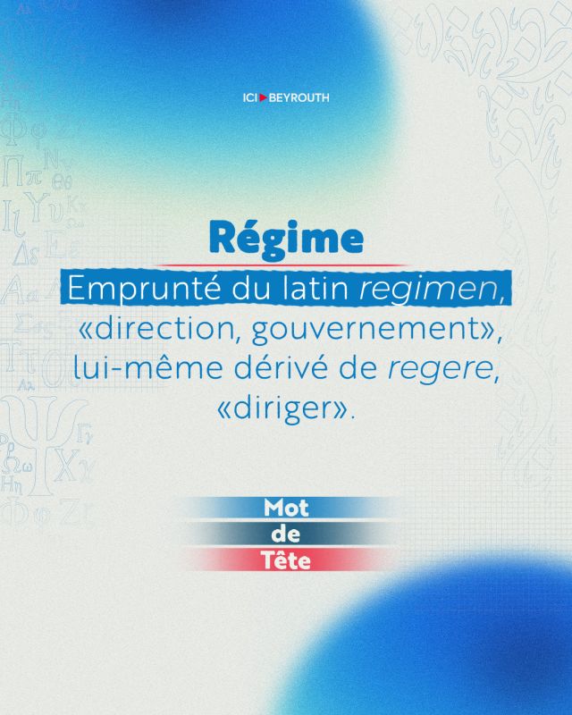 Le mot «régime» vient du latin regimen, «direction, gouvernement», issu de regere, «diriger». Il entre dans la langue française dès le XIVᵉ siècle, d’abord pour désigner l’action de gouverner et la manière de conduire les affaires publiques.