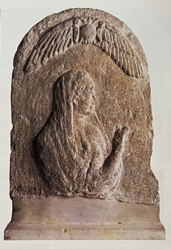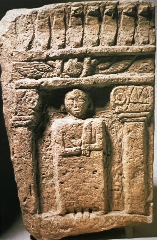 Disque ailé d’une stèle phénicienne, surmontée d’uraeus. Cagliari, Museo Archeologico Nazionale. (Photo M. Sabatino in Les Phéniciens)