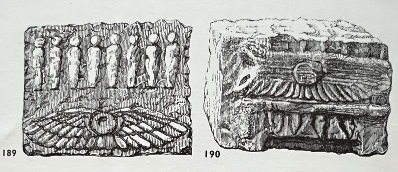 Il s'agit alors d'une tête ailée qui orne le linteau de la fenêtre près de l'entrée. En comparant cet exemple à la stèle de Yehawmilk au musée du Louvre, ou à celles découvertes à Tyr et à Sidon par Renan, nous remarquons un net rétrécissement des ailes, qui se rapprochent davantage du type chérubin chrétien que du modèle égypto-phénicien. Nous sommes ainsi passés graduellement du disque aux ailes rigides, vers un globe au plumage naturel, et de là vers le visage ailé.