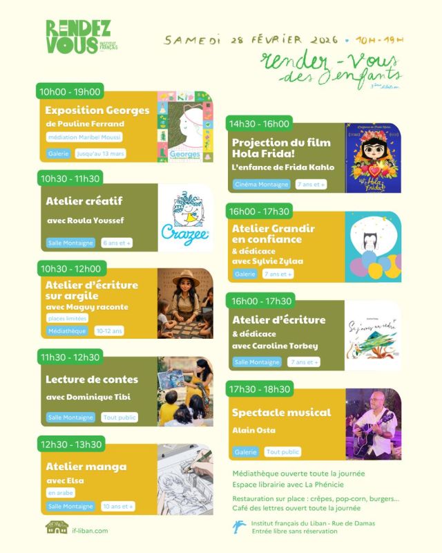 Après le succès de sa deuxième édition, qui avait rassemblé plus de 2.000 enfants et leurs familles en février 2025, le troisième « Rendez-vous des enfants » se tiendra le samedi 28 février 2026, de 10h à 19h, à l’Institut français du Liban (IFL) à Beyrouth.