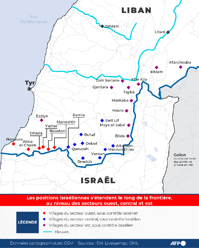 À la frontière sud du Liban, les forces israéliennes se sont positionnées sur les limites nord de Naqoura, une zone désormais entièrement contrôlée. Progressant vers le nord-est, elles se sont implantées aux frontières nord de Alma el-Chaab, Dhaïra, Boustan, Yarin ainsi que Marwahine. « À Marwahine, les destructions sont majeures, dans le sens où la localité a été complètement rasée», note le général Gemayel.