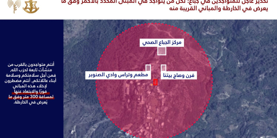 Le porte-parole arabophone de l'armée israélienne, Avichay Adraee, a lancé jeudi un avertissement aux habitants des villes de Jbaa et Mahrouna, dans le sud du Liban, les exhortant à évacuer les zones qui, selon lui, sont utilisées par le Hezbollah. Dans un message publié sur X, M. Adraee a annoncé que l'armée israélienne allait bientôt ...